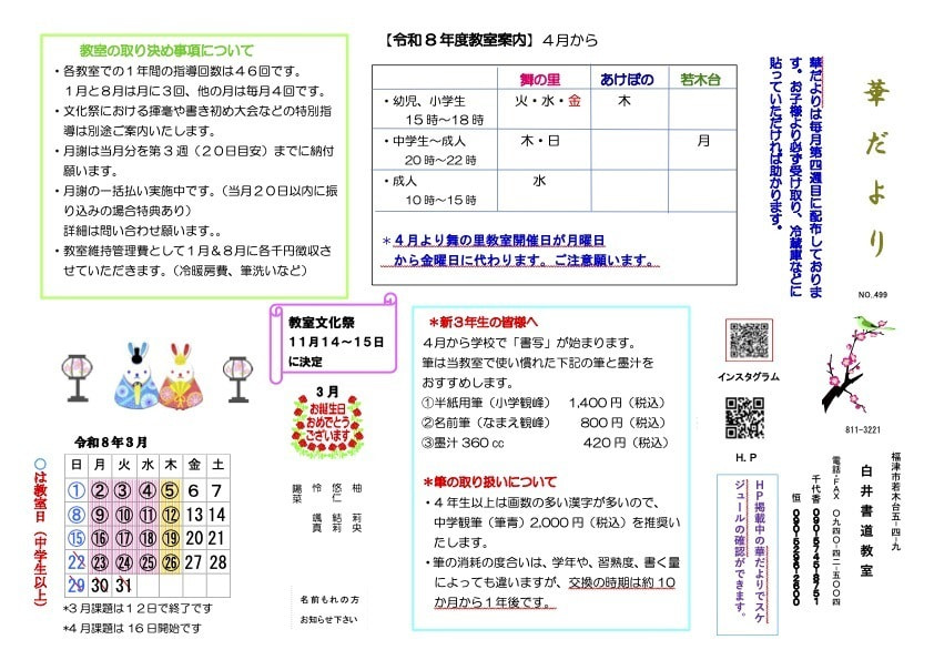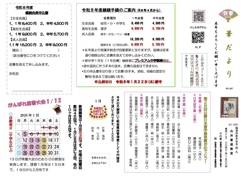 | 会費(手本代) | 幼児・小学生・中学生 8,400円/年 (半年 4,500円) 高校生・成人 9,900〜16,200円/年 (半年 5,700〜9,000円) *1年会費もしくは半年会費を選択可能 |