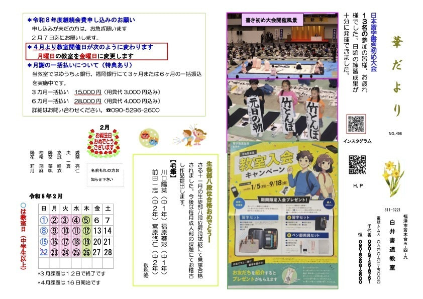 | 会費(手本代) | 幼児・小学生・中学生 8,400円/年 (半年 4,500円) 高校生・成人 9,900〜16,200円/年 (半年 5,700〜9,000円) *1年会費もしくは半年会費を選択可能 |